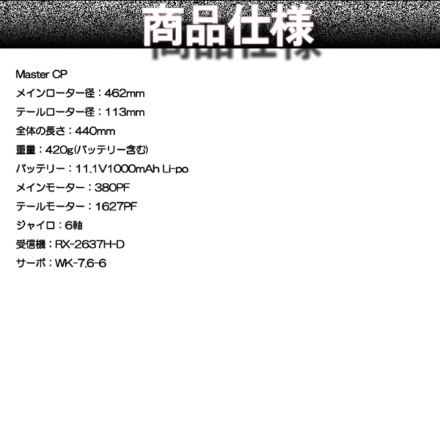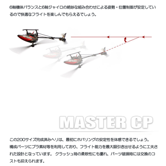 凄く安定感のあるヘリです。飛ばしやすく部屋の中でも、とても安定したホバリングが出来ます。(部屋の中では危険なので、やらない方よいのですが)購入して正解でした。一言だけ言えば飛行時間がもう少しながければ、でもMASTER CPは、とても良いヘリです。